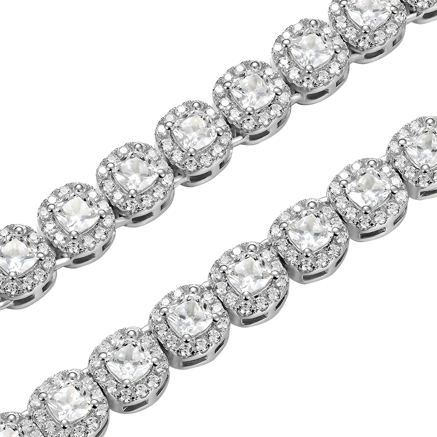 The striking cushion-cut cluster stones in the 7mm Moissanite Cushion-Cut Cluster Tennis Chain Necklace give a luxurious, diamond-like sparkle. The perfect mix of luxury and everyday wearability is offered by its 7mm design. This chain gives any pair a high-end, distinctive appearance and is made for long-lasting comfort and durability.