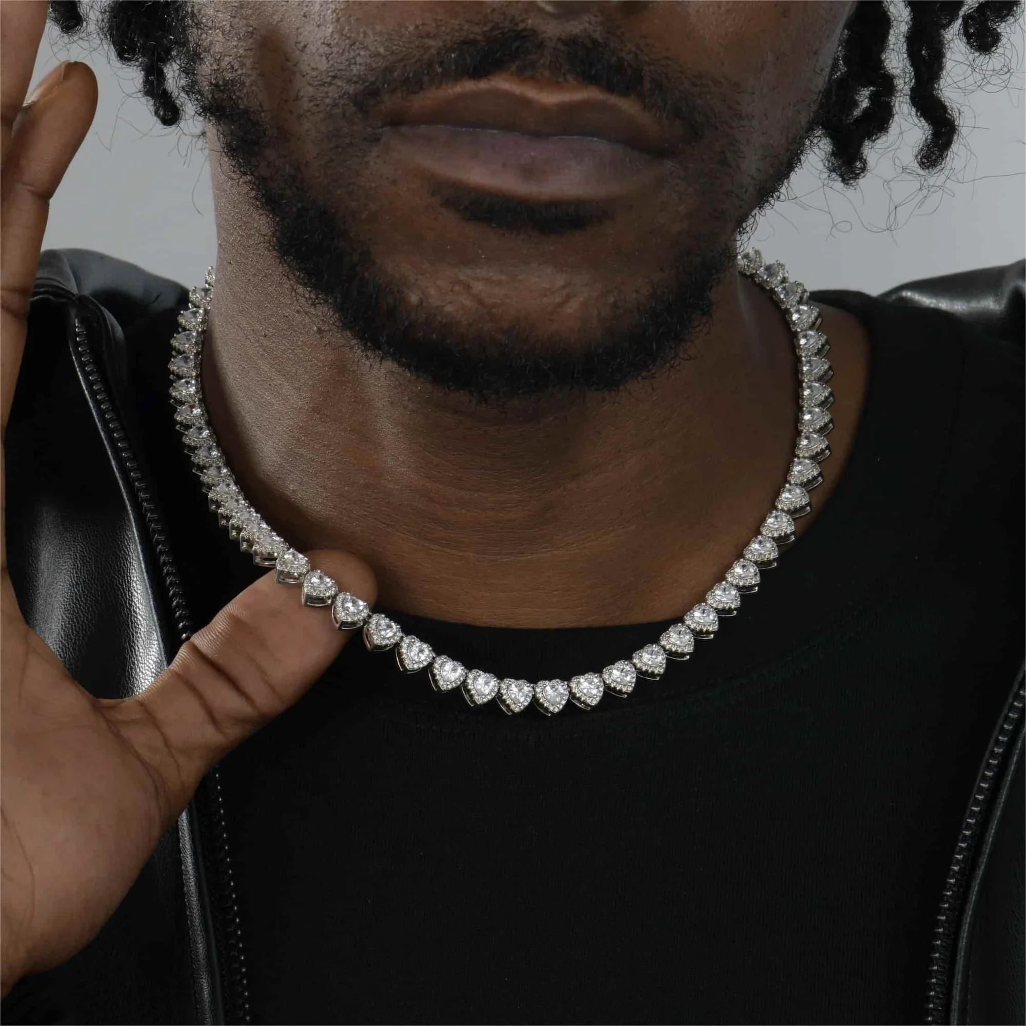 The 7mm Moissanite Heart-Shaped Cluster Tennis Chain has heart-shaped cluster stones that sparkle and glitter like diamonds. The 7mm design strikes the perfect blend between style and class. This chain is comfortable and built to last. It provides a romantic and luxurious touch to any outfit, whether you wear it every day or for special occasions.