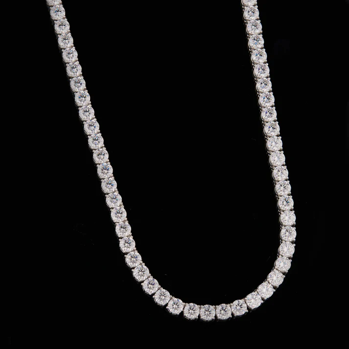The classic tennis chain design is featured in this piece through the row of perfectly set round stones that shine continuously without interruption. Completely covered with moissanite of the highest quality, it is exuding a strong brilliance and a sparkle similar to a diamond that catches the eye in any light.