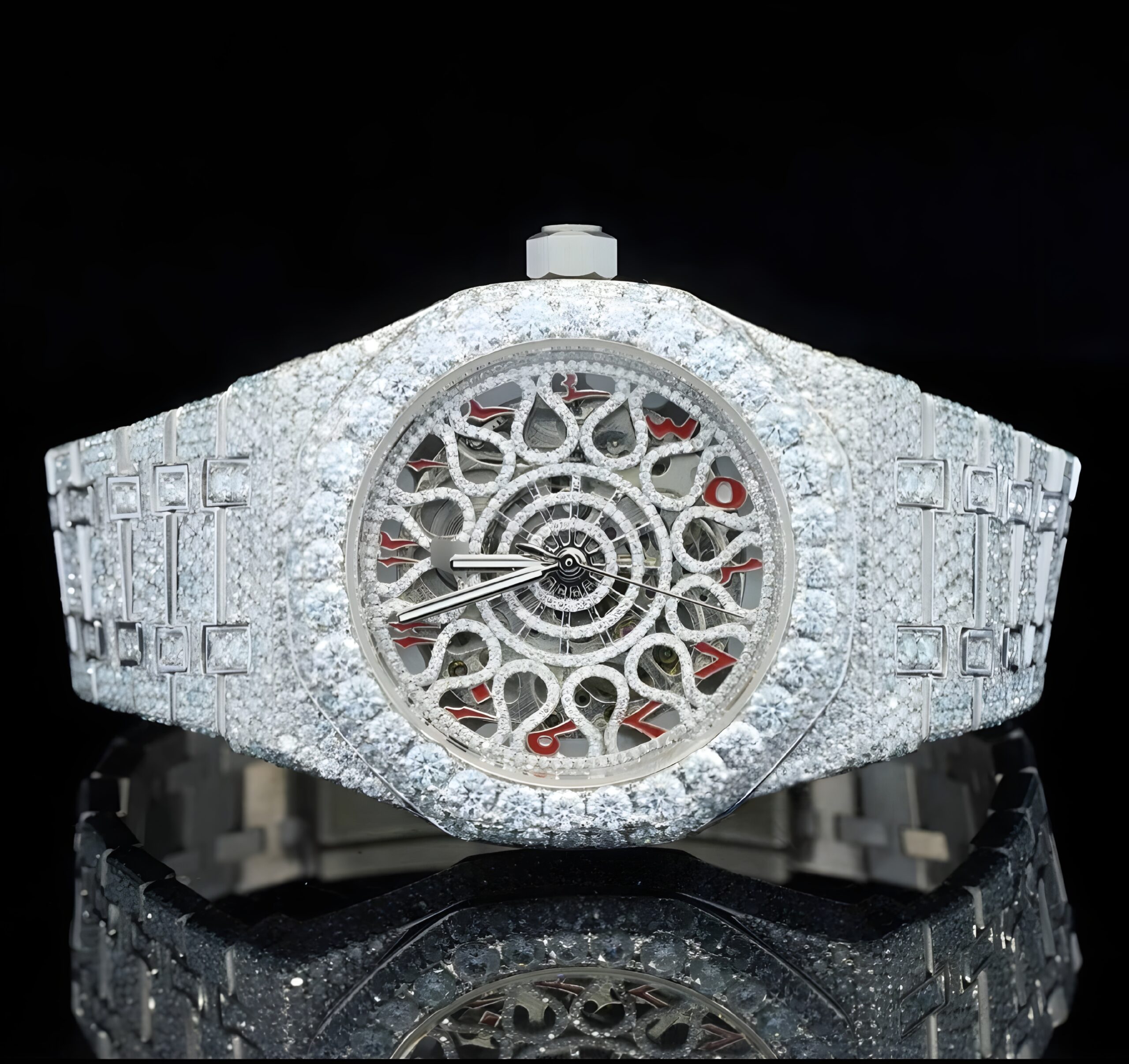 The Full Iced Out Red Arabic Number With Automatic Movement Moissanite Watch is a premium luxury timepiece designed for men who appreciate bold hip hop fashion and high-end jewelry watches.