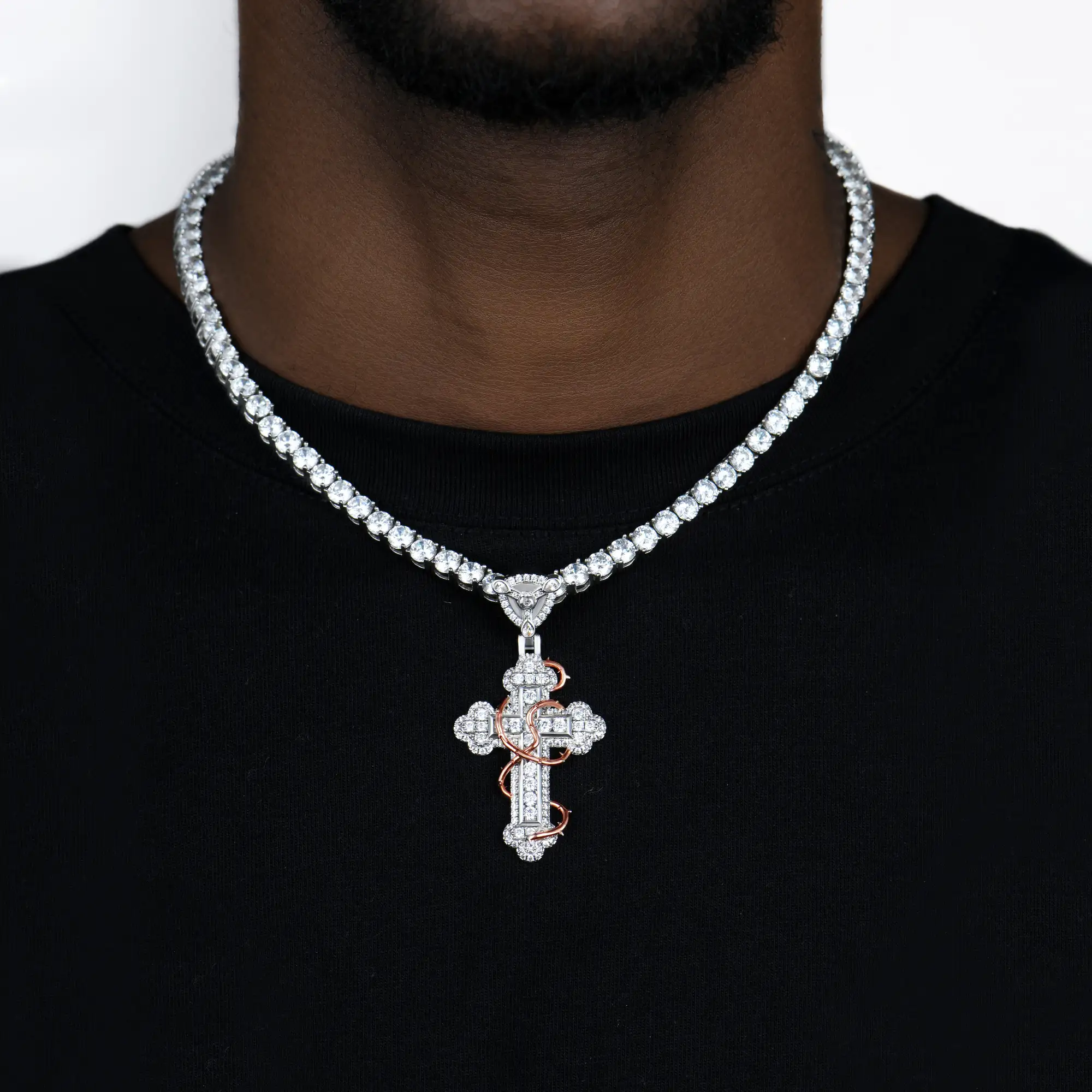 The Iced Thorned Blossom Cross Moissanite Pendant – Small features a unique thorn and blossom cross design with brilliant moissanite shine. Compact yet eye-catching, it symbolizes strength and beauty. Perfect for everyday wear, it offers a stylish and meaningful touch with lasting durability.