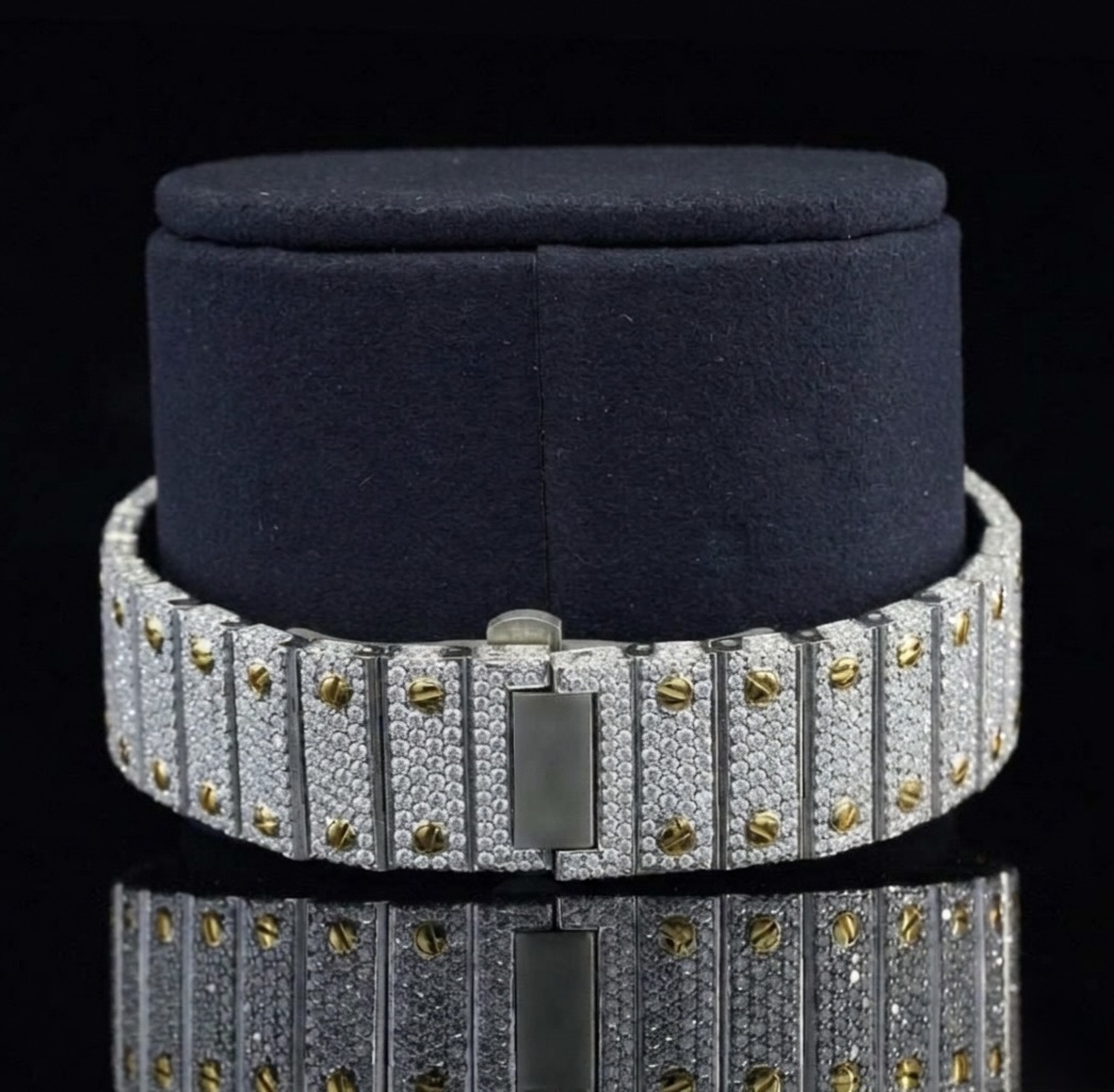 A expert diamond tester verified the authenticity and sparkle of the about 25 carat round brilliant cut moissanite diamonds in this high-end timepiece. This watch’s dependable Japan Automatic Movement ensures accuracy and durability.