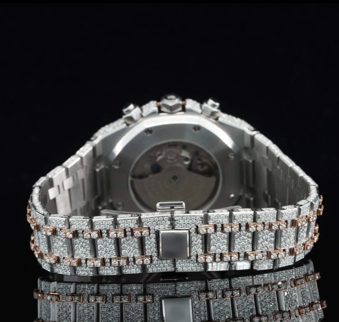 This stunning iced-out watch is tested using a professional diamond tester and powered by a reliable