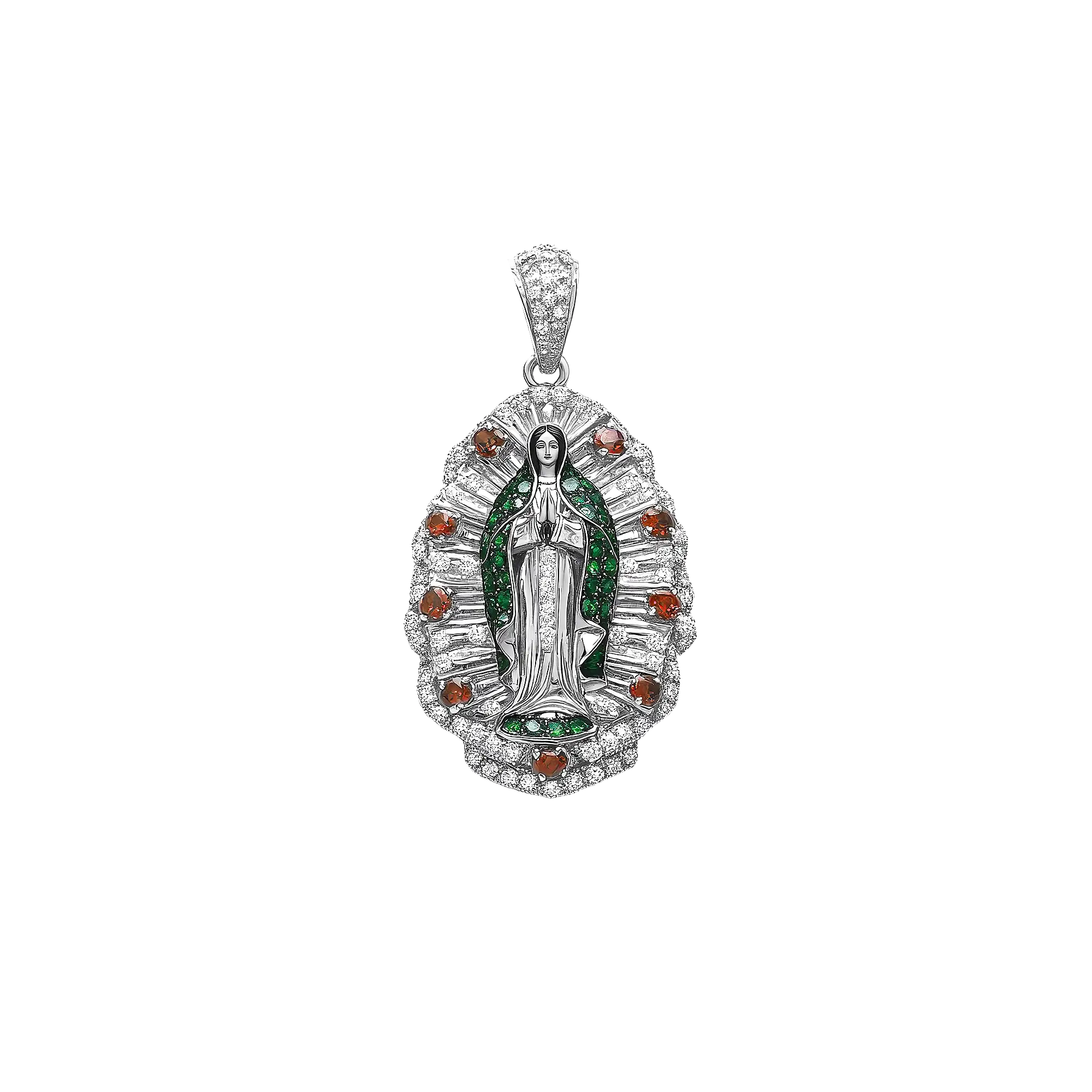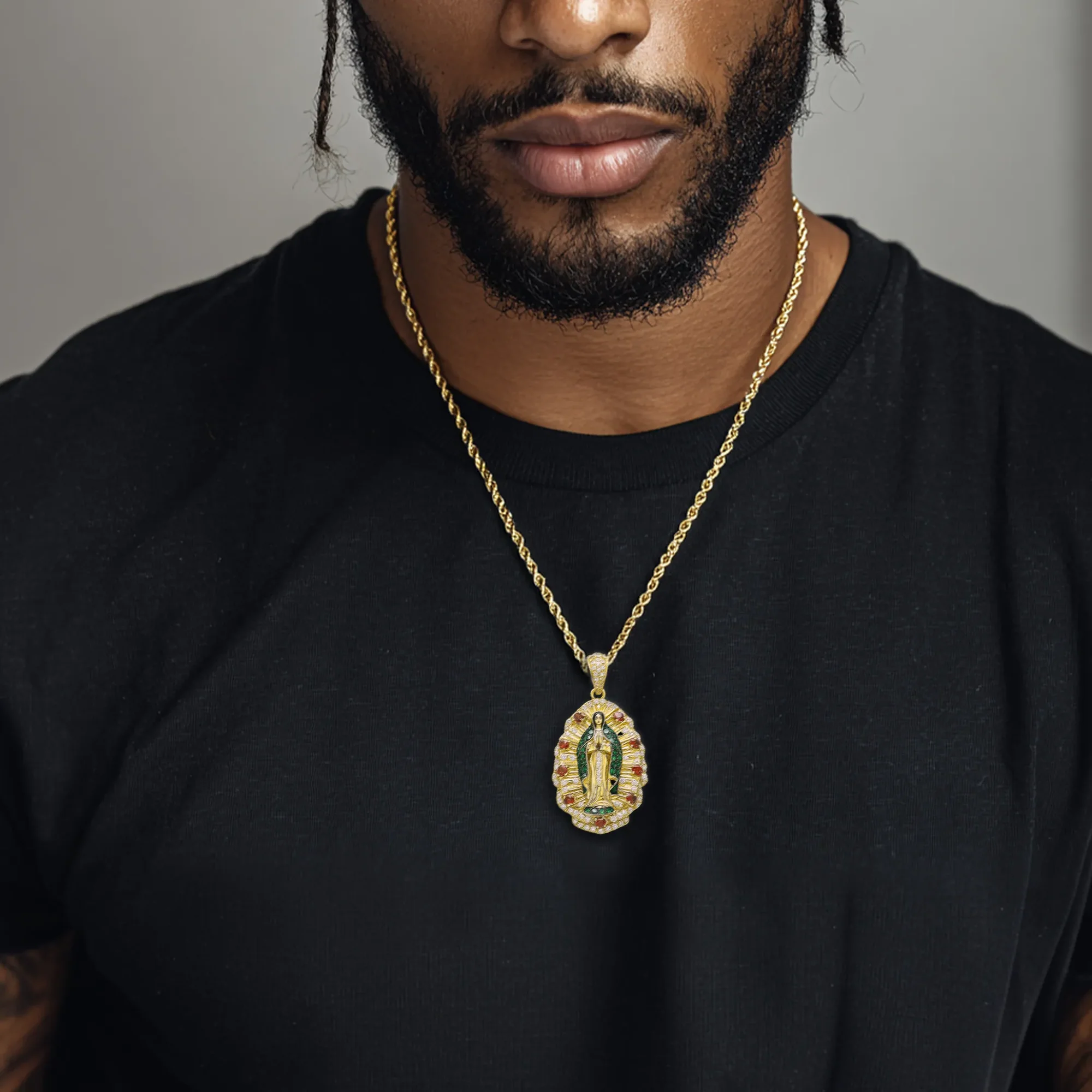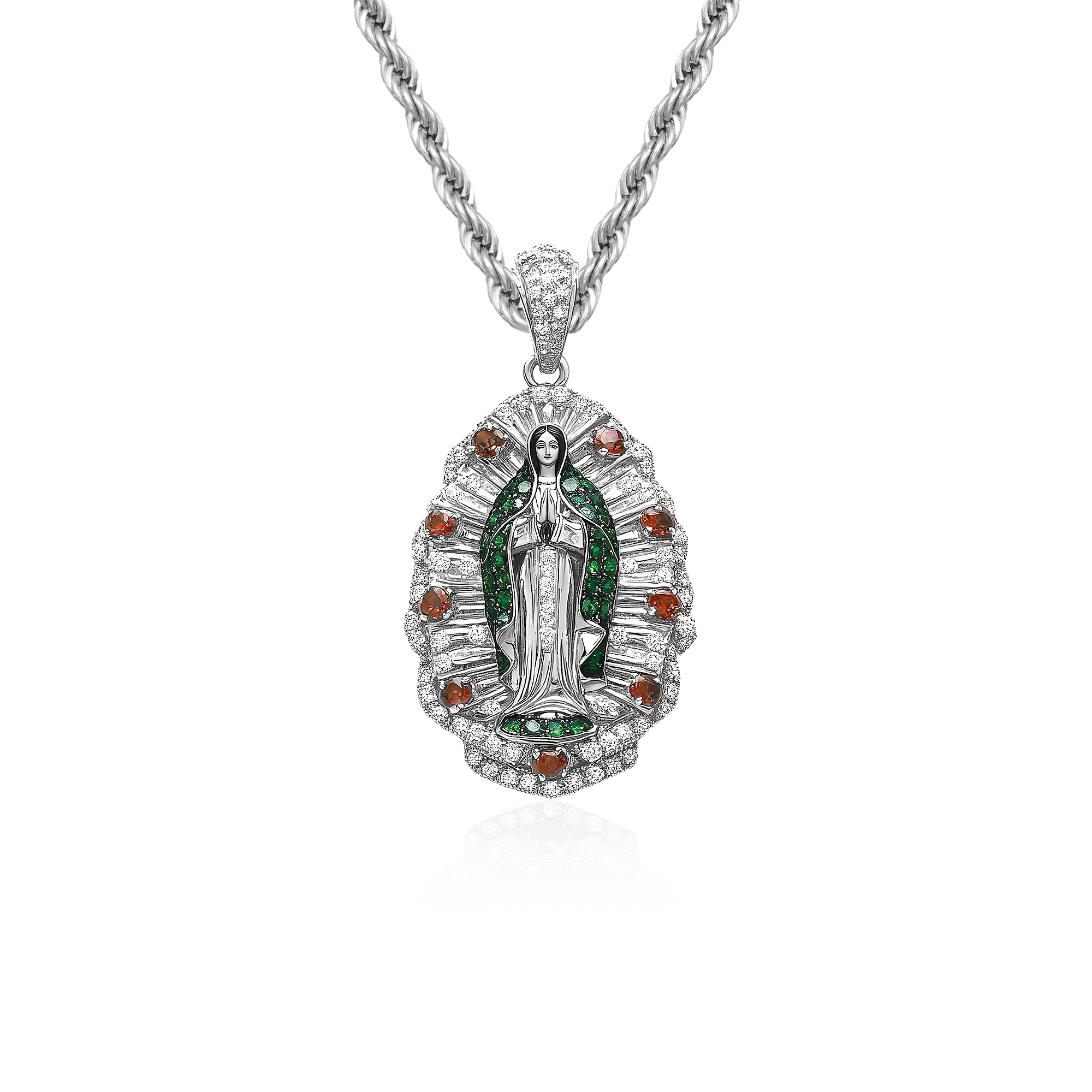 The Guadalupe Light Pendant, featuring complete pavé detailing and stunning red-green jewels, is modeled by the famous Mexican figure of Our Lady of Guadalupe. This item transforms spiritual reverence into a daring streetwear statement, radiating dedication, tradition, and power.