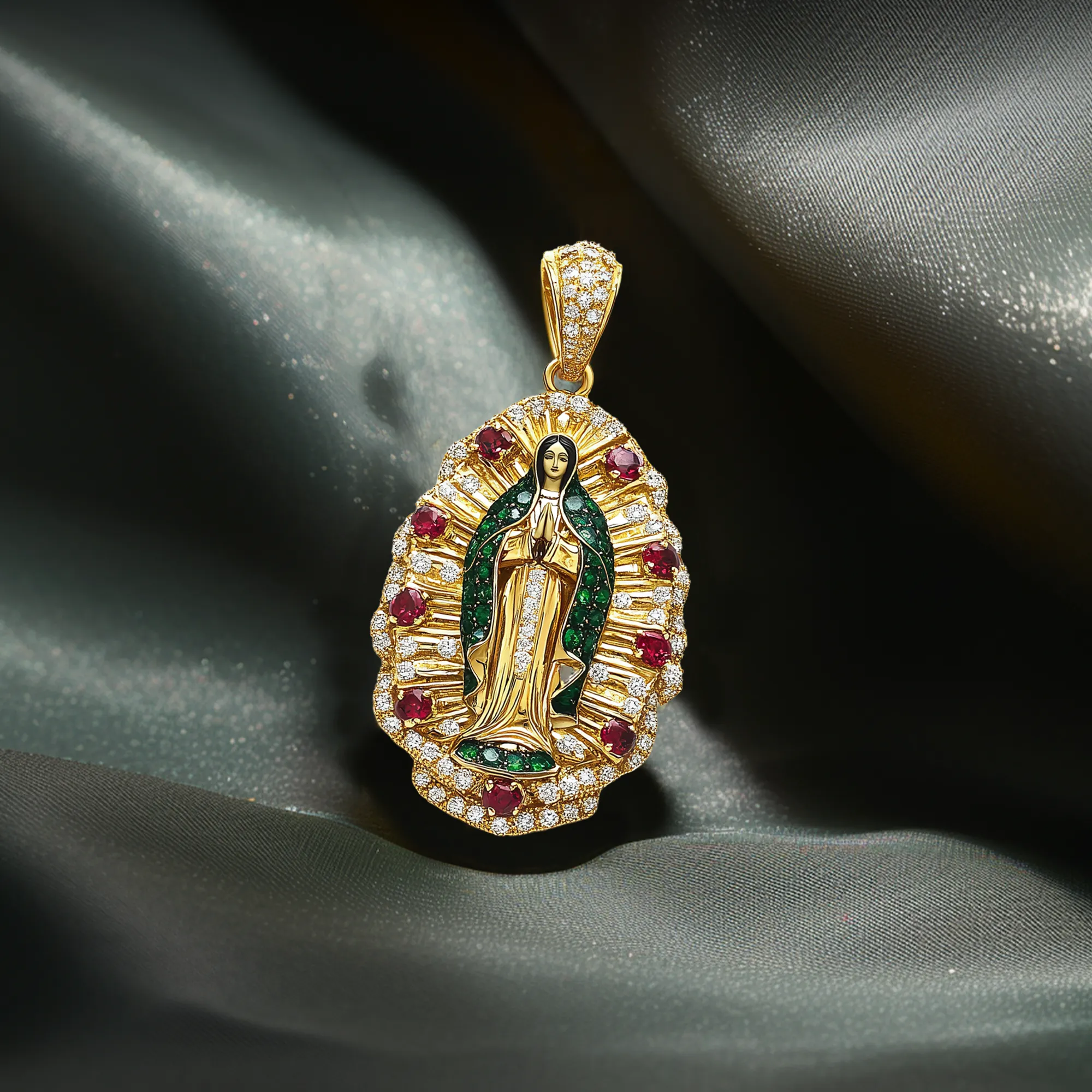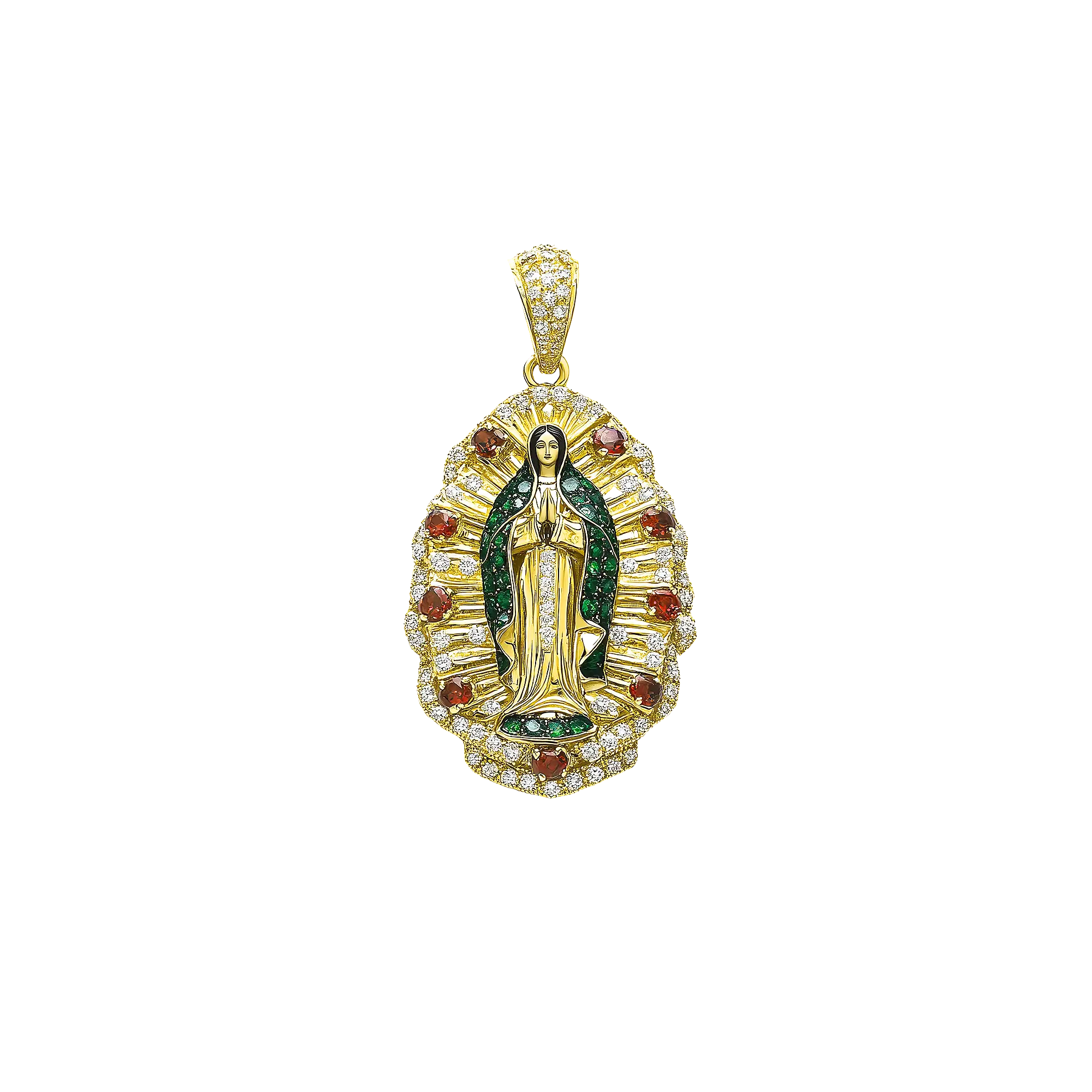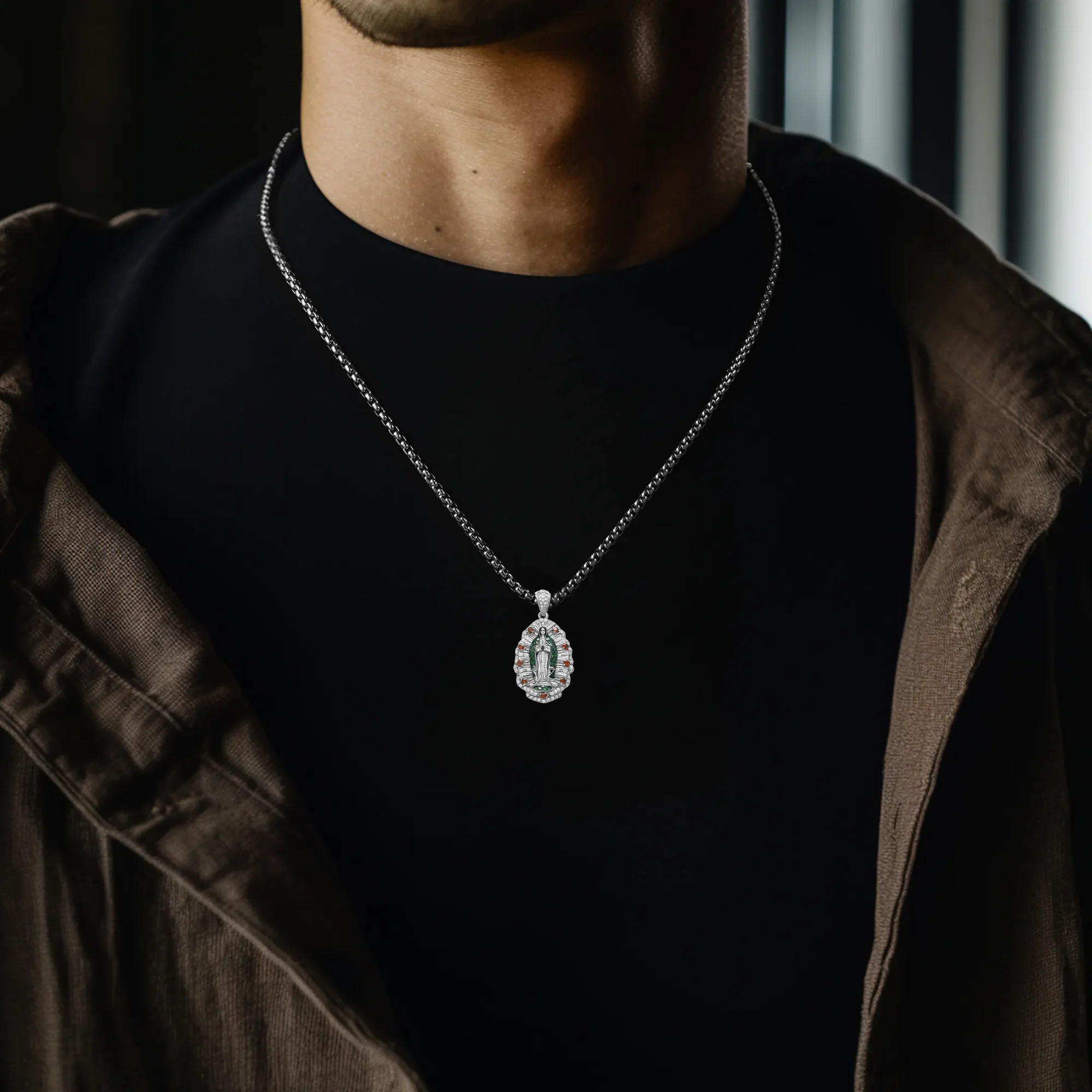 The Guadalupe Light Pendant, featuring complete pavé detailing and stunning red-green jewels, is modeled by the famous Mexican figure of Our Lady of Guadalupe. This item transforms spiritual reverence into a daring streetwear statement, radiating dedication, tradition, and power.